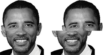 - O efeito de face composta (Young et al., 1987): quando duas metades de rostos diferentes são alinhadas, tendemos a integrá-las como uma só face, interferindo na identificação — outro marcador de processamento holístico.